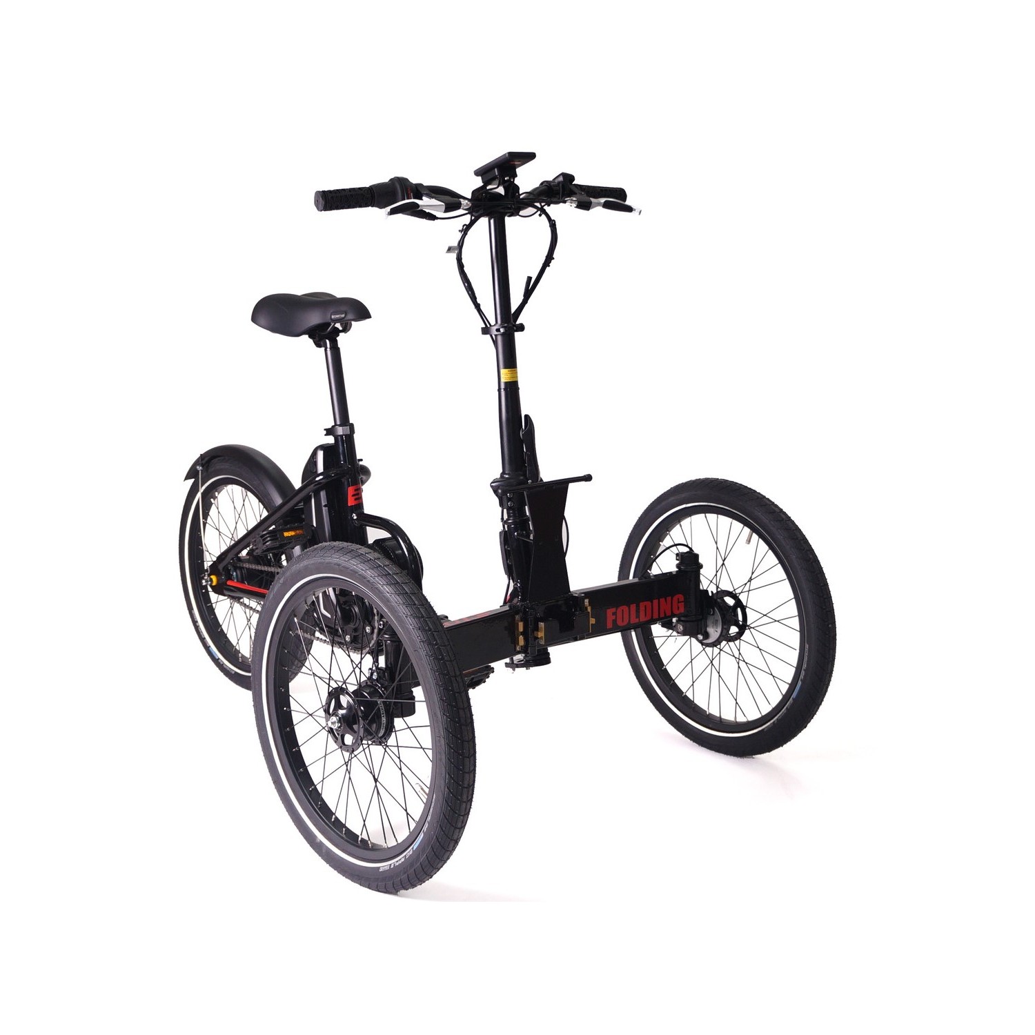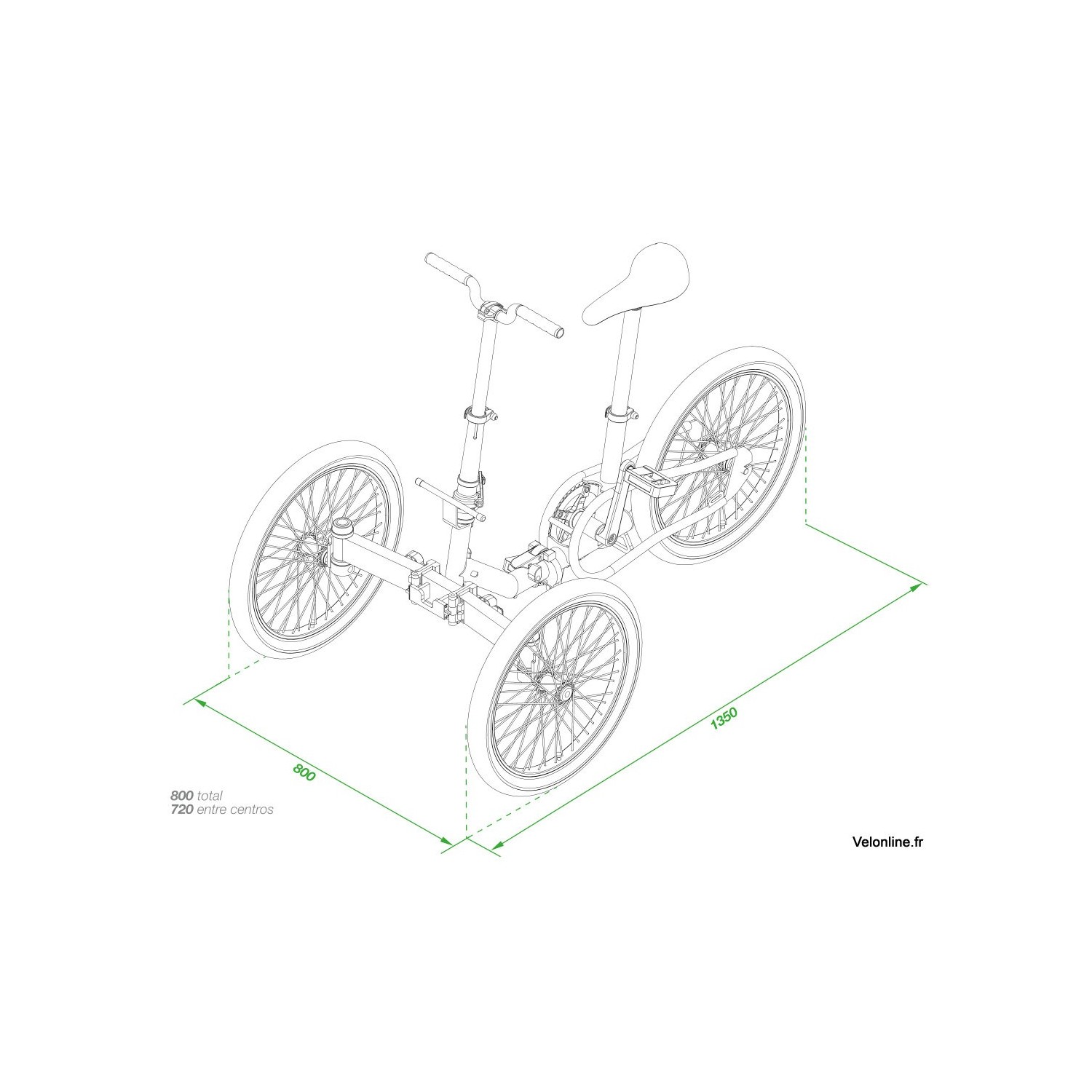 Les mesures du tricycle plié sont 80 x 69 x 39 cm, occupant 75% de moins qu’au début.
