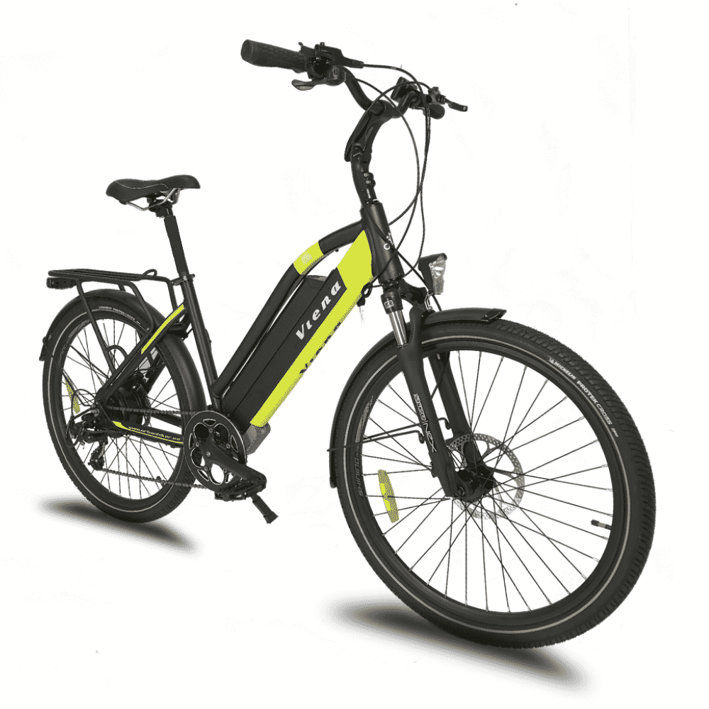 - Vélo VTC électrique modèle VIENA Urbanbiker avec une batterie Samsung lithium ION de 840 Wh (48v 17.5Ah) . Le chargeur est inclu. En mode éco, l’autonomie peut atteindre 160 km.